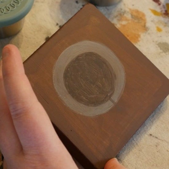 After applying the base coat, I usually paint silhouettes of the basic shapes. The Mandylion composition is essentially two concentric circles framed by a rectangular form: the mandylion.