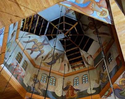 St John of the Ladder in Greenville, SC (OCA) recently caught fire after the dome was struck by lightning. The fire department quickly put out the fire and saved the building from further damage. However, the fire and water damage caused the Pantocrator icon in the dome to come crashing down.