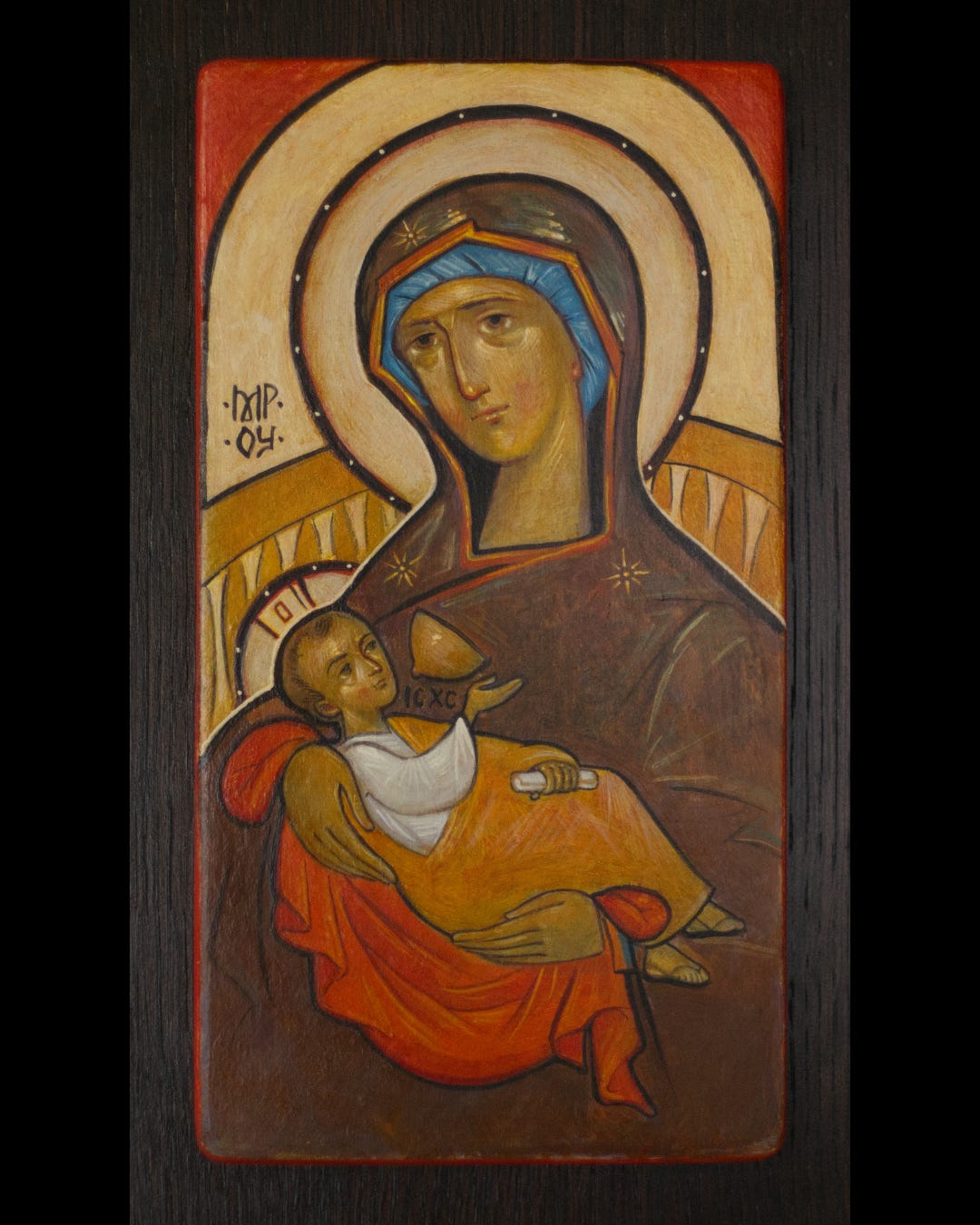 St Theodore the Studite said that “Christ’s image becomes more conspicuous to all when it appears by imprinting itself in materials.”2 There was no mechanical reproduction of icons at this time, and the understanding of St Theodore was that Christ’s image is self-imprinted on the painted icon through the iconographer’s materials. By what means was Christ’s image self-imprinted into materials? The human hand. I do not think it’s even remotely a stretch to conclude that there is a cooperation, a synergy, of God and man in the skilled production of icons. Outsourcing the ministry that was given to us by God through the incarnation of Jesus Christ to machines is like turning away from the good gift of a father. The Church’s support of living iconographers is a reception and reciprocation of God’s love. The human painting of icons is the best means of producing icons. It is by this means, specifically, that Christ’s image is most clearly visible to everyone.