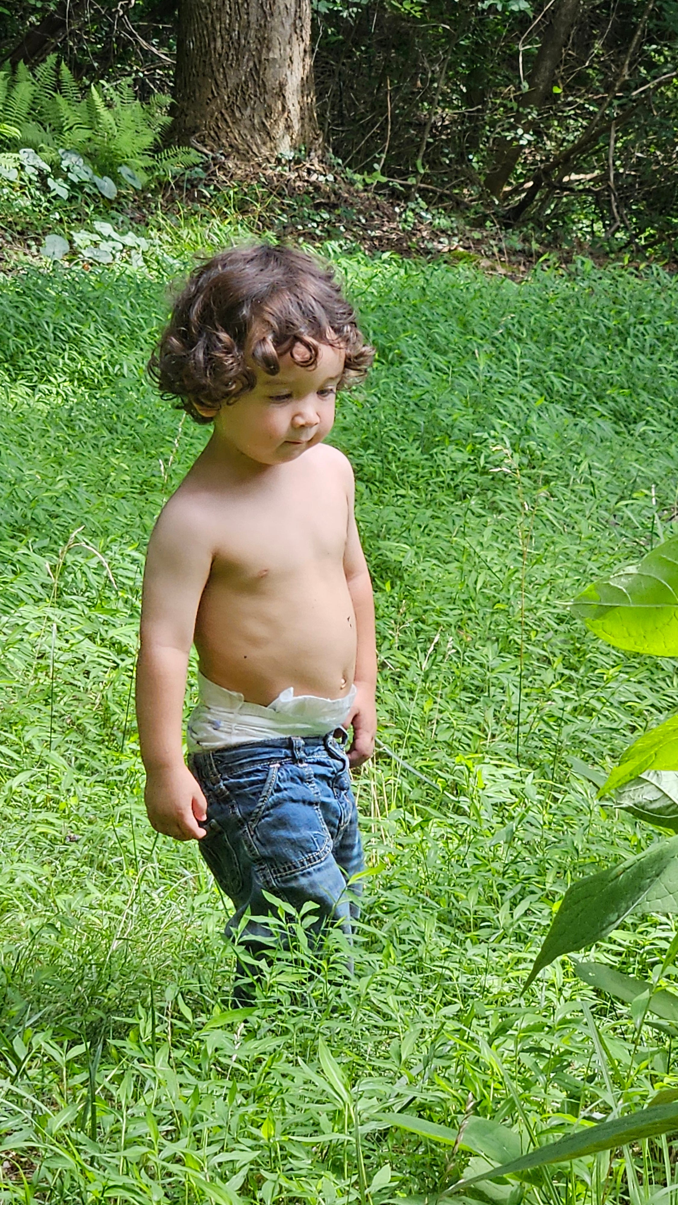 Symeon figured out how to unlock the back door to go outside today. I would be more upset if I wasn't so proud of how clever he is. I watched his soft little feet run over the wood shavings left on the porch as he urged me to help him onto the trampoline. Didn't even notice them poking his feet. Just wants me to hang out with him.